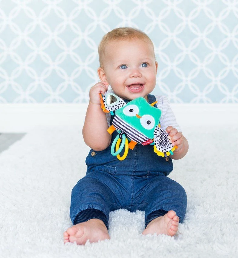Je kleintje zal zich zeker vermaken met de grappige, trillende uil met vrolijke kleuren en patroontjes. Het is heerlijk grijpen naar de twee ringen. Als je kindje aan het koordje trekt zal de uil vibreren. De verschillende texturen en patronen dragen bij aan de visuele ontwikkeling van je kindje. Je maakt het speeltje gemakkelijk vast aan de kinderwagen, autostoel of box.