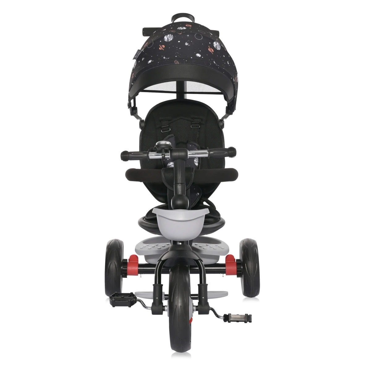 Je kunt gemakkelijk de zonnekap vastmaken aan het stoeltje, dit is erg handig voor buiten! Het zachte rubberen stuurtje heeft een belletje waar je kleine leuk mee kan rinkelen en de zonnekap heeft een mooie print van planeten en sterren, dit maakt de driewieler helemaal af!