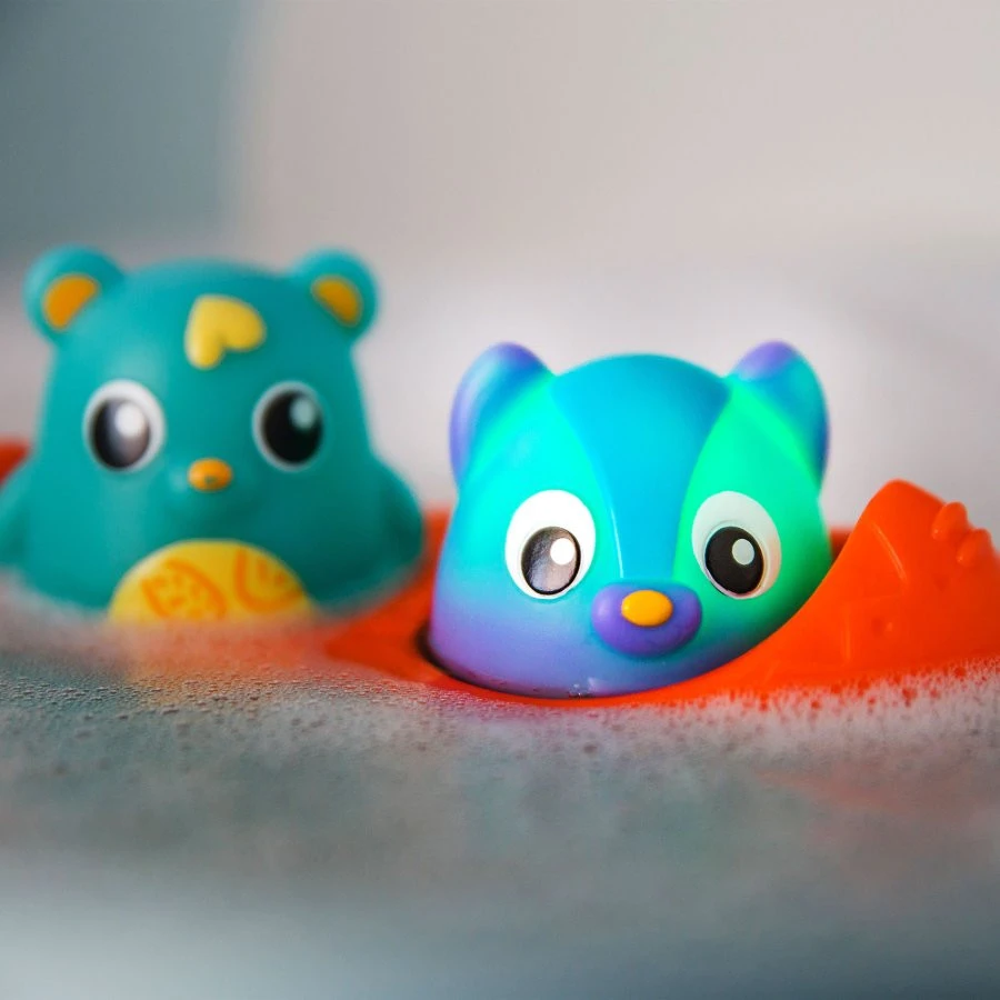 Meneer de beer en het kleine wasbeertje zitten gezellig samen in de kano. Zie hoe leuk het is als de twee vriendjes voorbij komen drijven. Je kleintje kan de twee diertjes ook uit de boot halen en zelf er weer in zetten. Zo stimuleer je de motorische ontwikkeling van je kleintje ook nog eens. De vrolijke beestjes maken van baddertijd een groot feest!